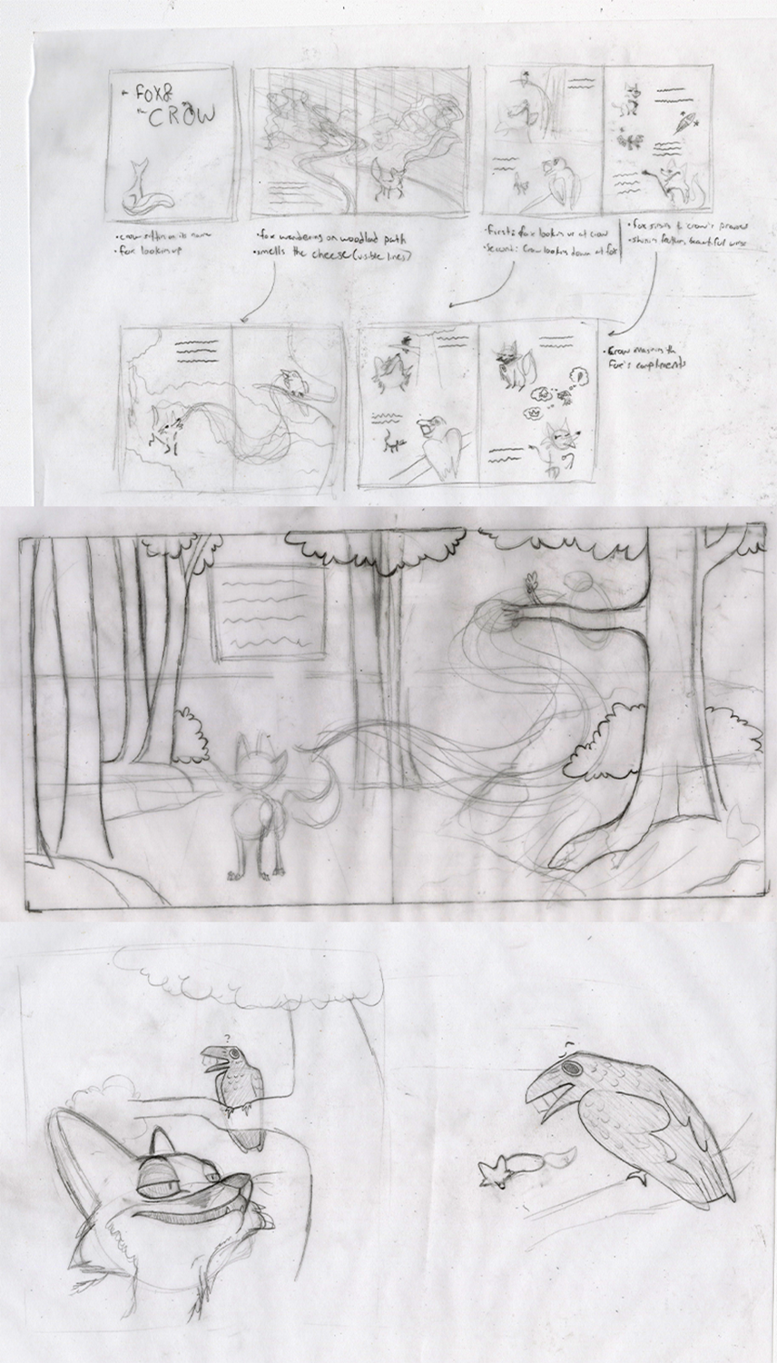 Above are a selection of moments from Aesop’s The Fox and the Crow. This was my first time creating a narrative scene like this. My goal was to experiment with perspective and create a cohesive environment across the pages. Aside from the scenery, it also required a bit of character design. The crow came to me almost instantly, so that helped dictate what direction I took the fox in.